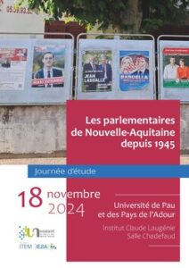 Bonjour, Nous sommes ravis de vous annoncer que la journée d’étude « Les parlementaires de Nouvelle-Aquitaine depuis 1945 », coordonnée par Laurent Jalabert (ITEM UPPA), se déroulera le 18 novembre 2024 . Organisée dans le cadre du programme de recherche [ https://item.univ-pau.fr/fr/programmes-de-recherche/programmes-en-cours-2/programmes-en-cours/elurenaq.html | Elurenaq ] , elle aura lieu à l’Université de Pau et des Pays de l’Adour, en salle Chadefaud de l’Institut Claude Laugénie. Retrouvez le programme complet à cette adresse : [ https://item.hypotheses.org/13142 | https://item.hypotheses.org/13142 ]
