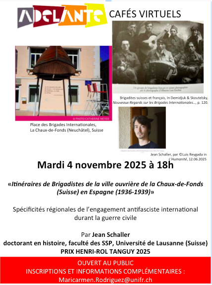 Nous aurons le plaisir d’accueillir Jean Schaller, lauréat du prix Henri Rol-Tanguy le mardi 4 novembre à 18h, pour une communication intitulée «Itinéraires de Brigadistes de la ville ouvrière de la Chaux-de-Fonds (Suisse) en Espagne (1936-1939) », où il abordera les spécificités régionales de l’engagement antifasciste international durant la guerre civile. Jean Schaller, petit-neveu de Brigadiste, a mené une recherche historique sur un groupe de volontaires de cette région pour son master 2 en histoire, à l’Université de Lausanne.